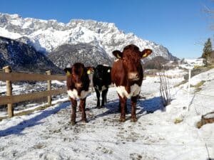 Bis zum Stallumbau im Jahre 2011 verfolgten wir das Ziel, hohe Milchleistungen zu erbringen. Mittlerweile setzen wir auf Tradition und alte Zuchtrichtungen (Pinzgauer). Wir besitzen fünf Mutterkühe mit Nachzucht. Es ist immer wieder eine große Aufregung, wenn ein neues Kälbchen geboren wird. Kinder wie auch Erwachsene fiebern mit der Mutterkuh mit, bis das Kleine endlich mit gemeinschaftlich erwähltem Namen im Stall steht.
